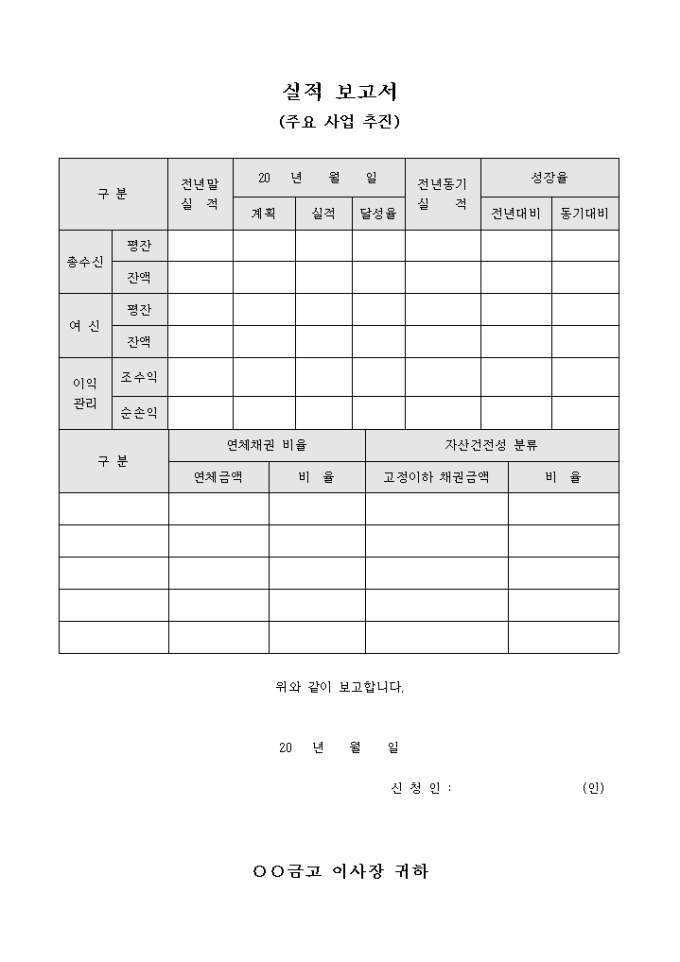 9,000원/월주요사업추진 실적보고서 입니다. 전년말 실적과 전년동기 실적등으로 구성되어 있습니다. 금융계통의 실적을 보고할때 사용되는 문서입니다.