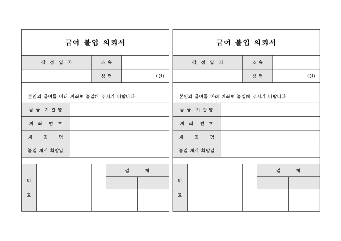 9,000원/월회사에서 사용하는 급여불입 의뢰서 입니다. 불입지점금융기관, 지점, 계좌번호, 예금주명으로 구성되어 있으며, 급료와 상여를 새로운 계좌로 불입의뢰시 사용되는 문서입니다.