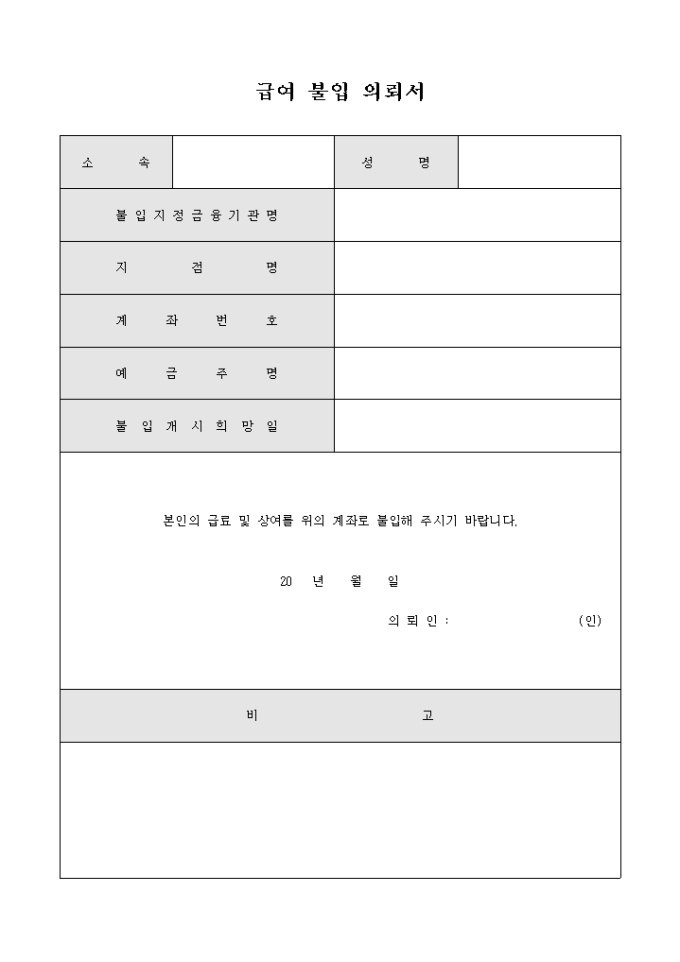 회사에서 사용하는 급여불입 의뢰서 입니다. 불입지점금융기관, 지점, 계좌번호, 예금주명으로 구성되어 있으며, 급료와 상여를 새로운 계좌로 불입의뢰시 사용되는 문서입니다. 용지절약용입니다.