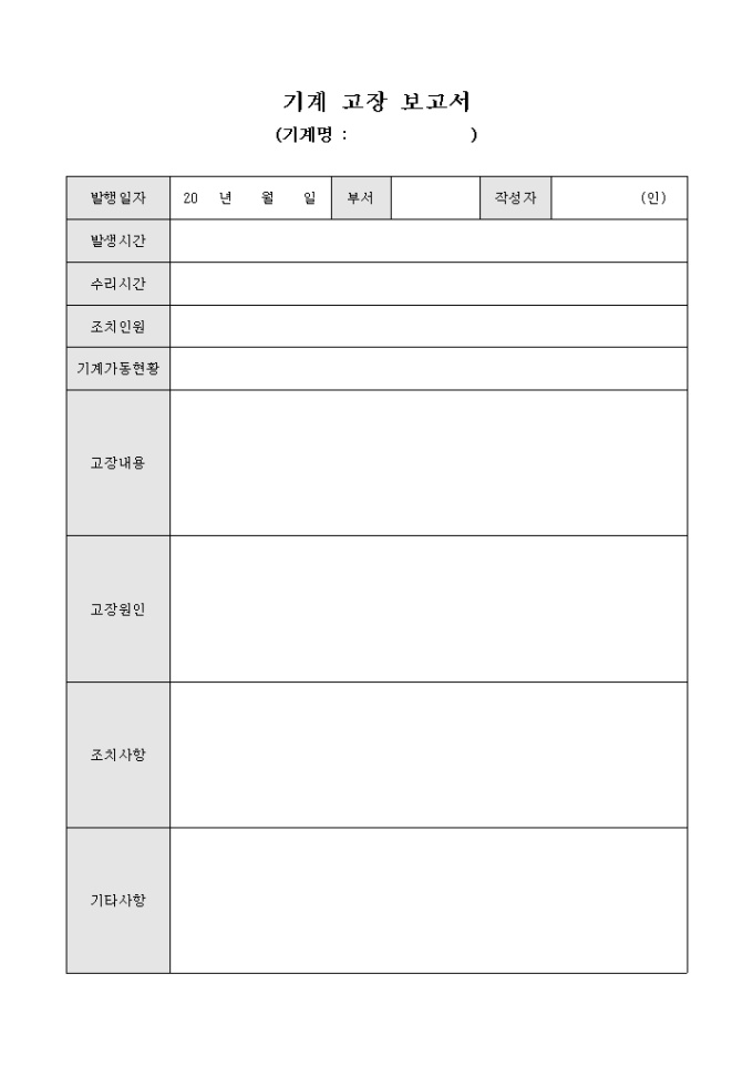 9,000원/월출판 인쇄업에서 사용하는 기계고장 보고서 입니다. 기계의 고장원인과 고장내용, 조치사항, 기타사항등으로 구성되어 있으며 보고하고자 할때 사용되는 문서입니다.