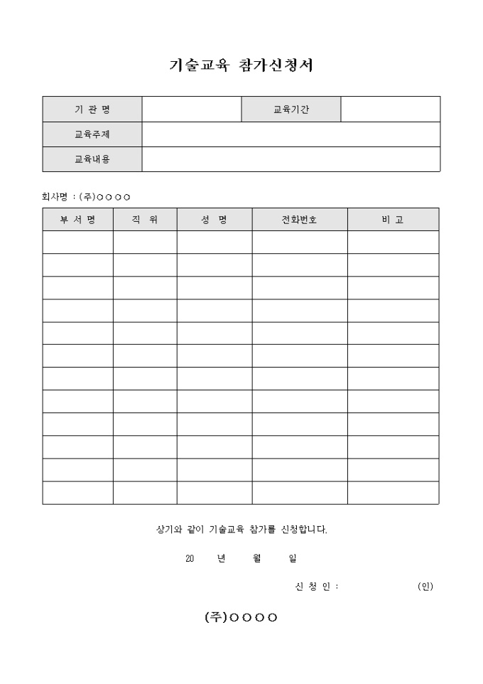9,000원/월회사에서 사용하는 기술교육 참가 신청서입니다. 교육주제, 교육내용, 교육기간, 교육자 등으로 구성되어 있으며 기술교육을 참가하고자 할때 사용되는 교육참가 신청서 입니다.