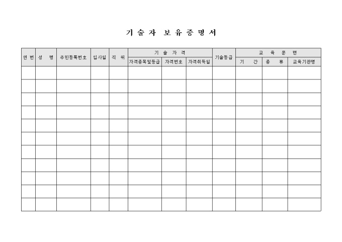 기술자 보유 증명서 입니다. 기술자의 성명, 직위, 기술자격, 교육훈련등으로 구성되어 있으며 기술자의 보유현황을 증명할수 있는 문서입니다.