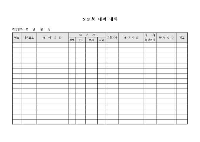 9,000원/월회사에서 사용하는 노트북 대여 내역입니다. 대여기간과 대여자, 대여사유, 반납일자등으로 구성되어 있습니다.
