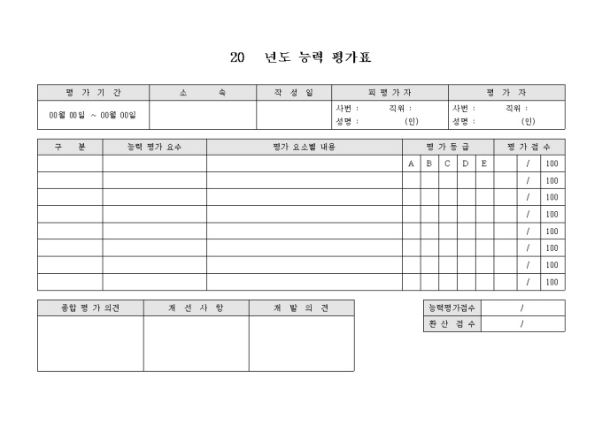 9,000원/월회사에서 사용하는 능력평가표 입니다. 평가요소별 내용과 능력평가 요수, 평가등급등으로 구성되어 있습니다.