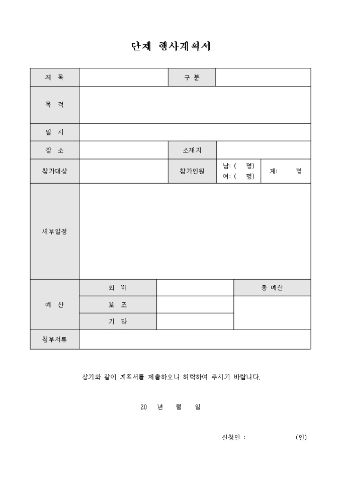 9,000원/월행사를 하기전 사용되는 행사 계획표입니다. 행사의 목적과 장소, 세부일정, 예산등 행사에대한 계획을 제출할때 사용됩니다.