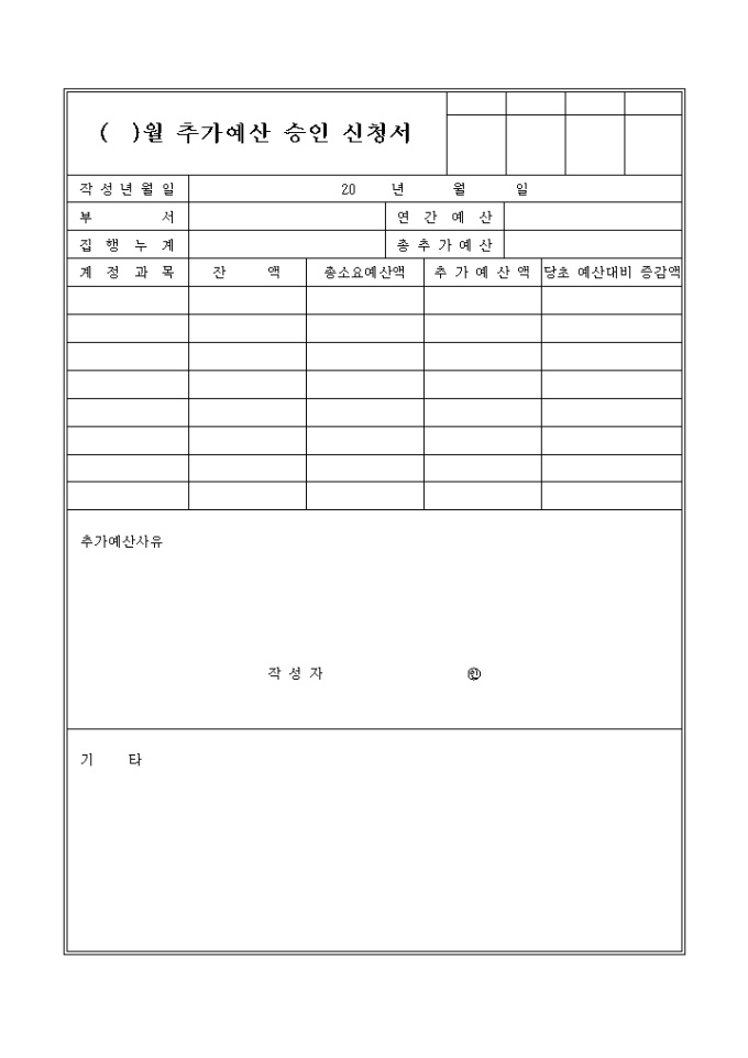 9,000원/월총소요예산액, 추가예산액, 당초 예산대비 증감액 등을 기록하는 추가예산승인신청서입니다.