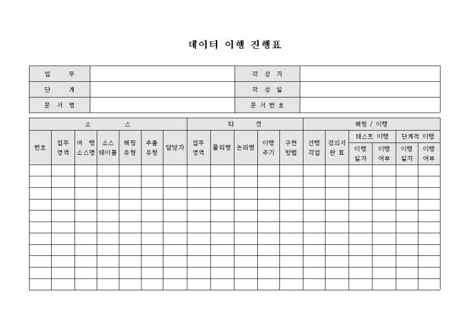 9,000원/월데이터 이행 진행표 입니다. 소스, 타겟, 매핑, 이행, 업무, 단계등으로 구성되어 있습니다.