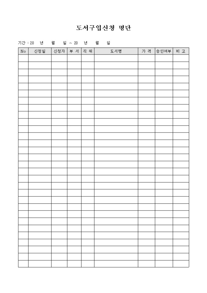 회사에서 사용하는 도서구입 신청명단입니다. 신청자, 부서, 도서명, 가격등으로 구성되어 있의며 도서를 구입하고자 하는 신청인원을 기록할때 사용합니다.