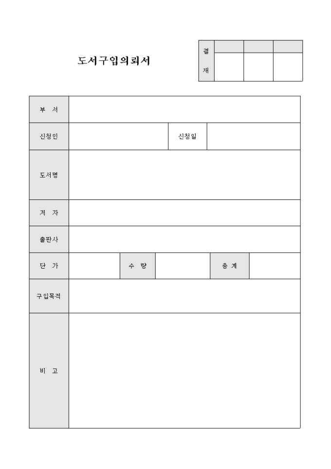 회사에서 사용하는 도서구입 의뢰서 입니다. 부서와 신청인, 도서명, 구입목적등으로 구성되어 있으며 구입하고자 하는 도서 의뢰시 사용됩니다.