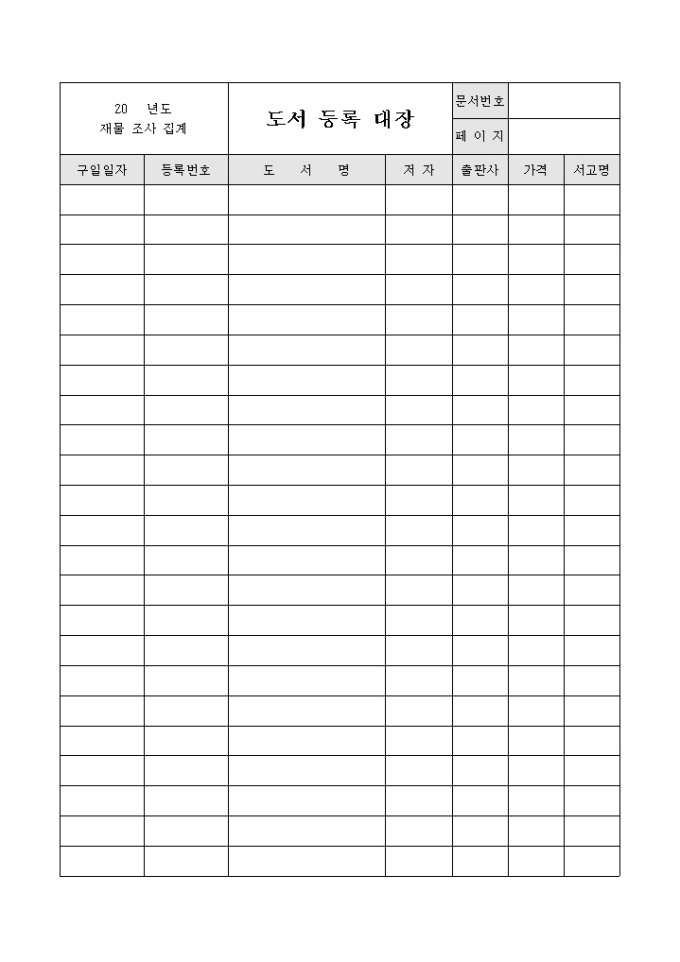 9,000원/월재물 조사 집계시 사용되는 도서등록 대장입니다. 구입일자, 도서명, 가겨등으로 구성되어 있으며 재물조사집계시 도서등록내역을 기록할수 있도록 구성되어 있습니다.