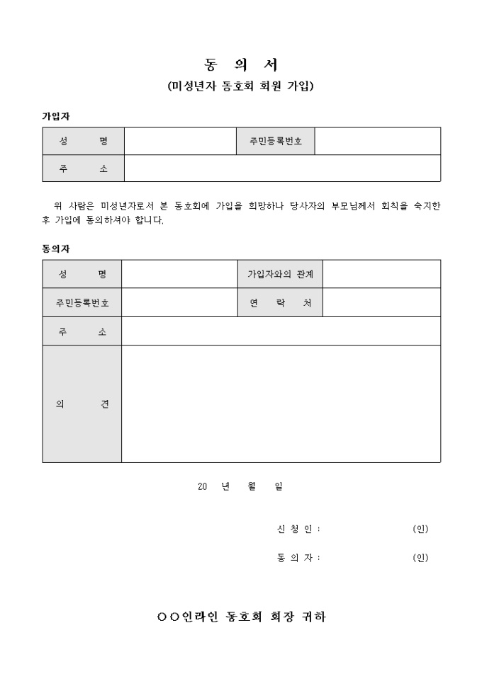 9,000원/월미성년자가 동호회 가입을 하고자 할 때 보호자의 동의가 필요한 경우 동의자의 확인을 득하여 이를 확인할 수 있게끔 제작된 서식입니다.