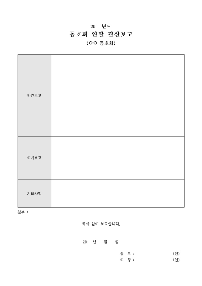 9,000원/월동호회의 연말 결산 관련 사항을 보고할 때 사용하기 위한 서식으로써 안건보고, 회계보고, 기타안건의 사항을 기입할 수 있게끔 제작된 서식입니다.