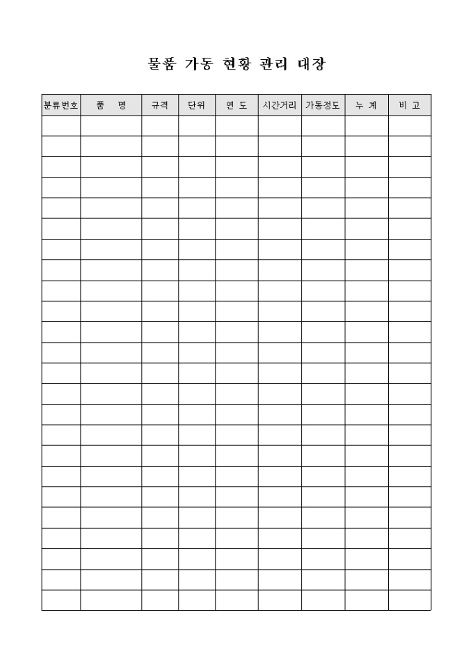 9,000원/월물품의 가동현황을 관리할때 사용하는물품 가동현황 관리대장입니다. 품명, 규격, 단위, 가동정도등으로 구성되어 있습니다.