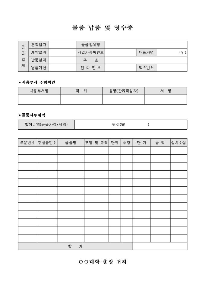 대학교내 물품 납품과 대금 처리의 확인을 위한 물품 납품 및 영수증 양식입니다. 공급업체의 일반사항과 물품 사용부서의 수령확인, 납품 물품에 대한 세부내역 등의 항목으로 구성되어 있습니다.