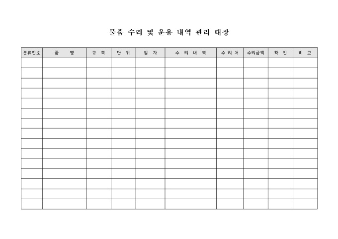물품 수리 및 운용 내역을 관리할때 사용하는 관리대장입니다. 품명, 규격, 단위, 수리내역, 수리처, 수리금액등으로 구성되어 있습니다.