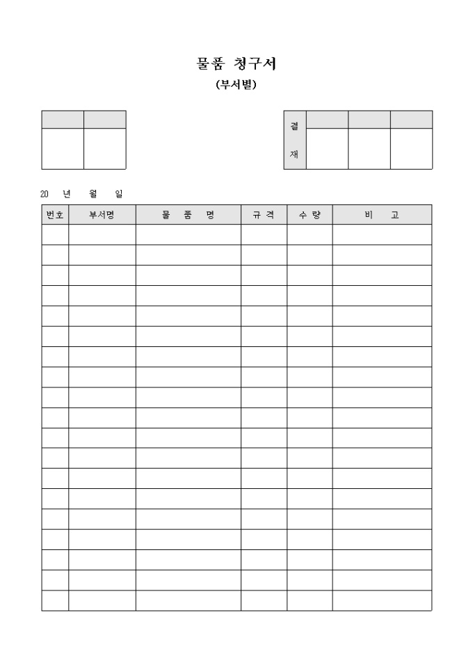 회사에서 사용하는 부서별물품청구서 입니다. 부서명, 물품명, 규격, 수량등으로 구성되어 있습니다. 물품청구시 사용됩니다.