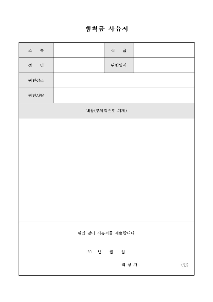 9,000원/월회사에서 사용하는 범칙금 사유서 입니다. 범칙금의 내용과 위반에 관련된 내용등을 기록할수 있습니다.