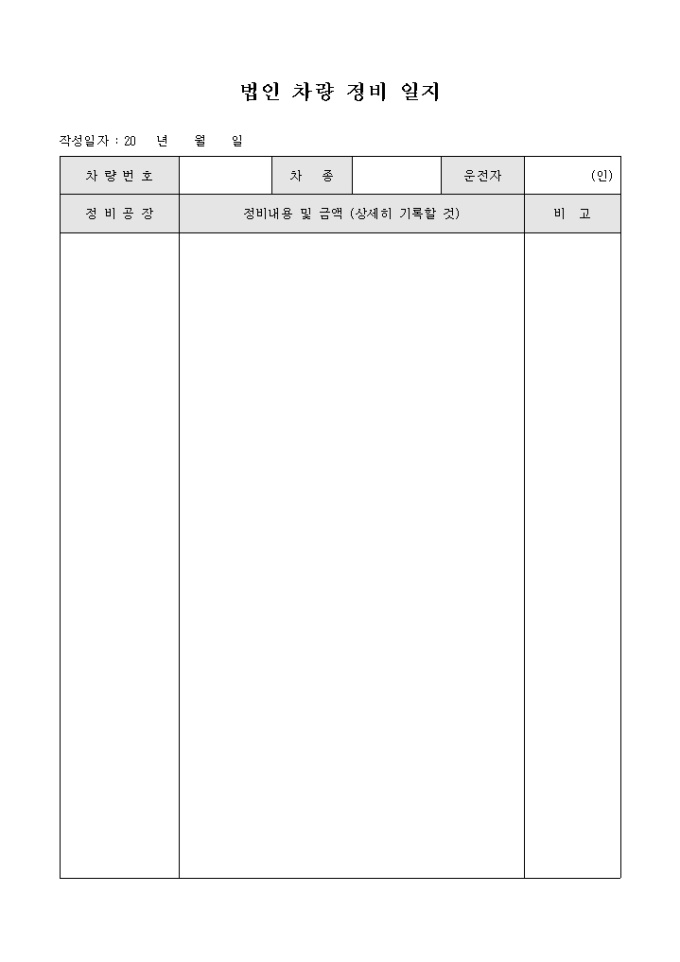법인차량정비 일지입니다. 정비공장, 정비내용등으로 구성되며 차량의 정비신청시 사용되는 문서입니다.
