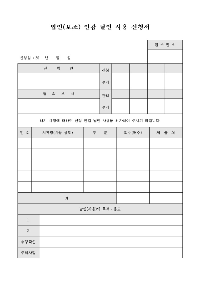 법인(보조) 인감 날인 사용 신청서