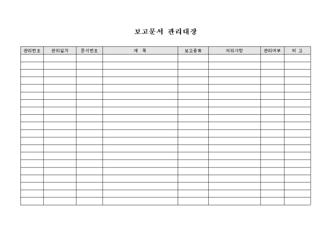 9,000원/월공통적으로 사용하는 보고문서 관리대장입니다. 관리번호, 관리일자, 문서번호, 제목, 처리사항등으로 구성되어 있습니다.