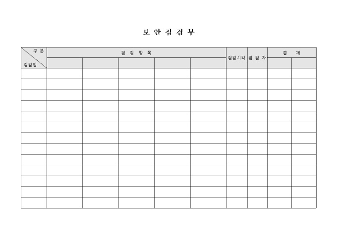 일자별로 보안에 대한 점검항목과 점검시각, 점검자 등의 항목을 작성할 수 있는 보안 점검부 양식입니다.