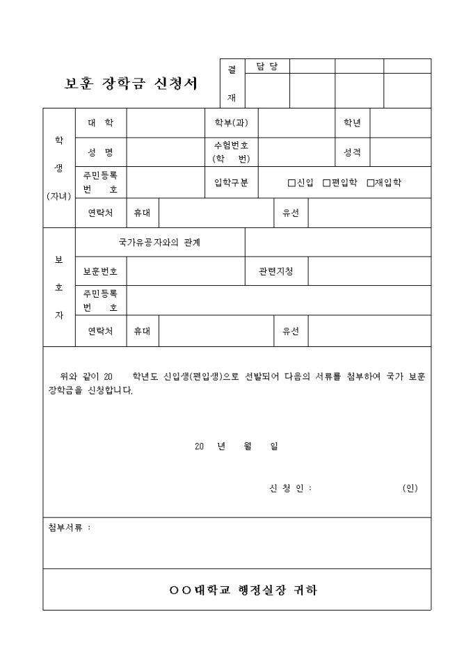 9,000원/월대학 입학생 중 국가유공자 자녀 등의 사유로 보훈 장학금을 신청하는 내용의 보훈 장학금 신청서 양식입니다. 학생의 인적사항과 국가유공자와의 관계, 보호자의 인적사항 등의 항목으로 구성되어 있습니다.
