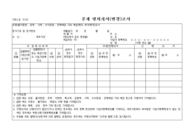 공채 명의개서(변경)조서 양식입니다.