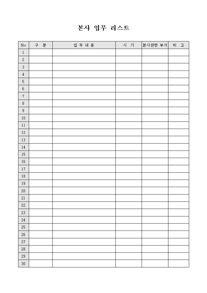 9,000원/월업무내용, 시기, 본사관련 부서의 항목으로 구성된 본사 업무리스트입니다.