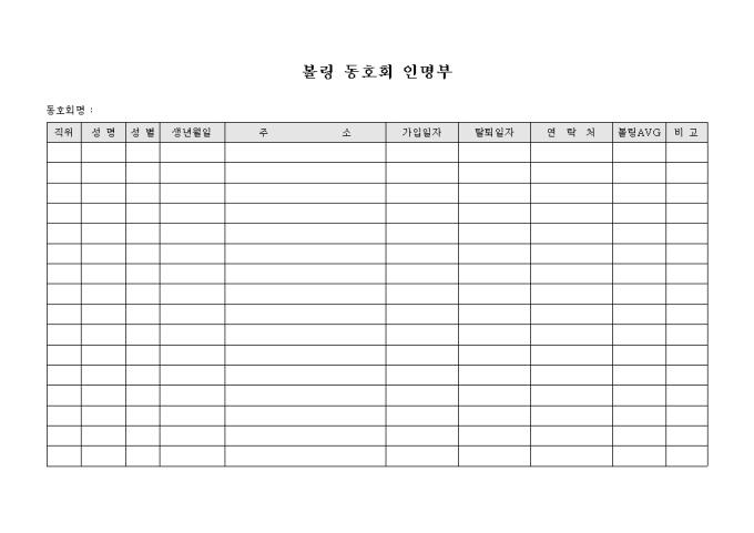 볼링 동호회에서 사용하는 인명부입니다. 성명, 성별, 주소, 가입일자, 탈퇴일자, 연락처등으로 구성되어 있습니다. 볼링 동호회원등을 관리할때 사용됩니다.