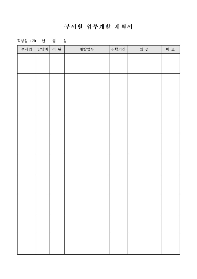 9,000원/월부서별 업무 개발 계획서 입니다. 개발업무, 수행기간, 의견등으로 구성되어 있습니다. 부서별로 업무개발 계획을 세울때 사용하는 문서입니다.