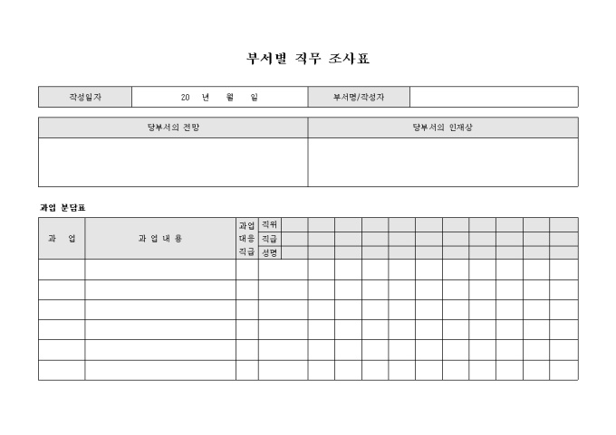 9,000원/월부서별로 사용하는 직무 조사표입니다. 과업과 과업내용등을 기록할수 있습니다.