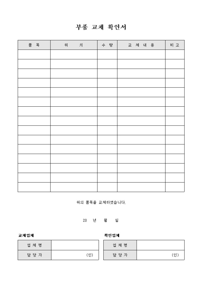 부품교체 확인서 입니다. 부품교체 품목과 위치, 교체내용등을 확인하고자 할때 사용합니다.