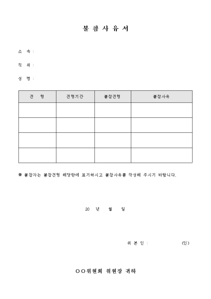 9,000원/월불참사유서 입니다. 불참사유에 관한 내용과 첨부서류등에 대한 내용을 기록할때 사용합니다.