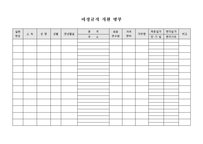 9,000원/월비정규직 직원명부 입니다. 비정규직 직원의 개인 신상정보등을 기록할때 사용합니다.