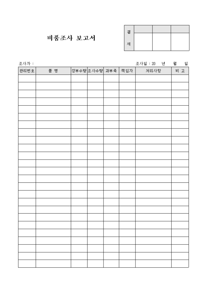 9,000원/월관리번호, 품명, 장부수량, 조사수량, 과부족, 책임자, 처리사항의 항목으로 구성된 비품조사 보고서 양식입니다.