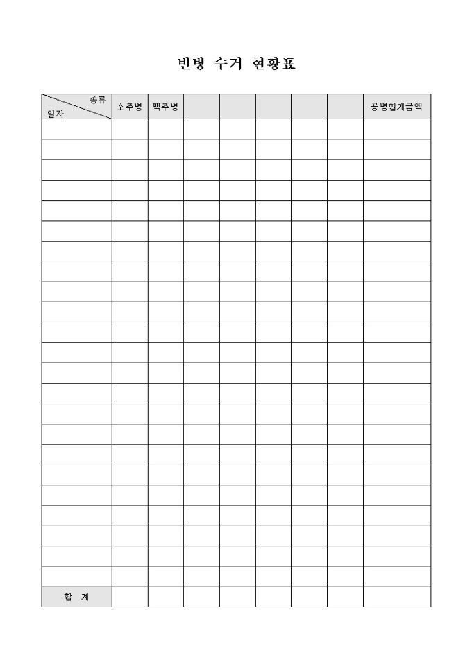 9,000원/월슈퍼마켓이나 매장 등의 빈병을 수거하는 업소에서 현황을 체계적으로 관리하기 위해 만들어졌으며 소주병, 맥주병 등의 항목을 구체적으로 기입할 수 있게끔 제작된 서식입니다.