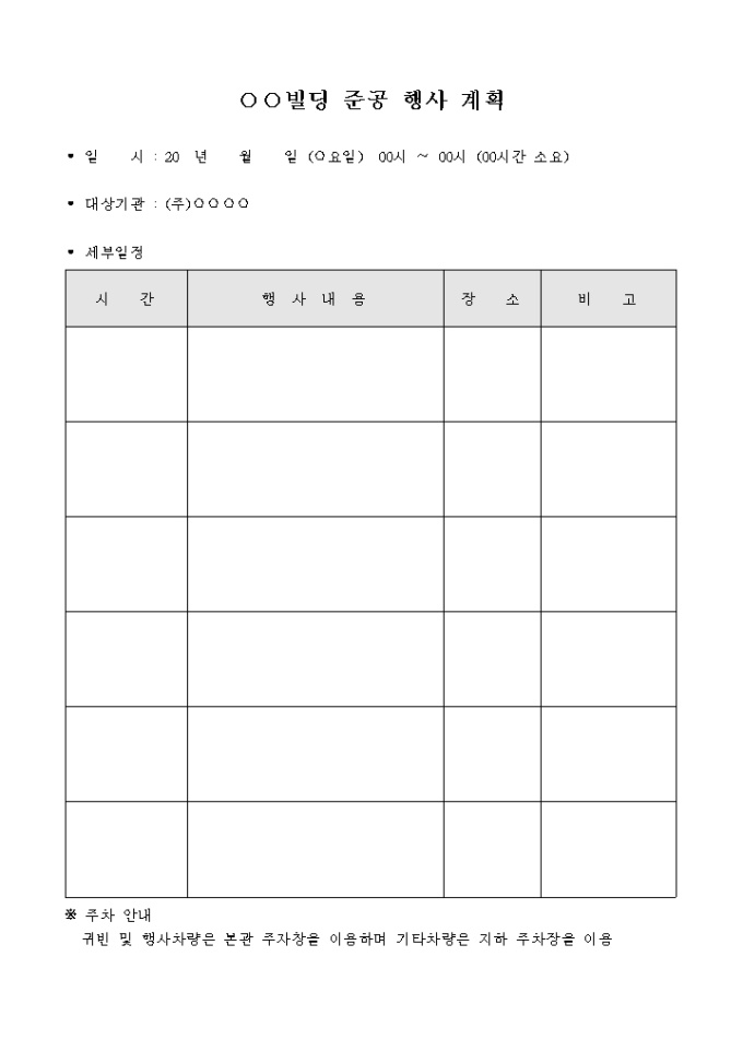 일시, 대상기관, 세부일정으로 시간, 행사내용, 장소 등의 항목으로 구성된 빌딩 준공 행사 계획서입니다.