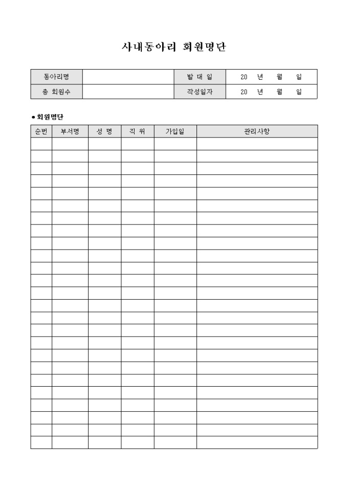 동아리명, 발대일, 총회원수, 작성일자의 사항을 간략하게 기입하고 부서명, 성명, 직위, 가입일, 관리사항의 항목으로 구성된 회원명단이 합쳐진 사내 동아리 회원 명단 양식입니다.