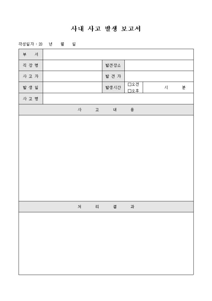 9,000원/월작성일자, 부서, 직장명, 사고자, 발견장소, 발견자, 발생일, 발생시간, 사고명을 간략하게 기입할 수 있으며 사고내용, 처리결과를 서술형태로 작성할 수 있는 사내 사고 발생 보고서 양식입니다.