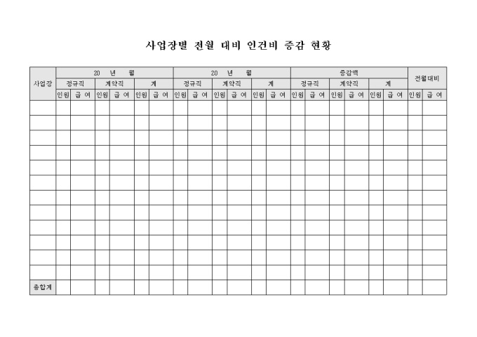 사업장별 전월과 당월의 정규직, 계약직 인원 현황 및 급여를 기입하여 증감액을 비교할 수 있는 사업장별 전월대비 인건비 증감 현황입니다.