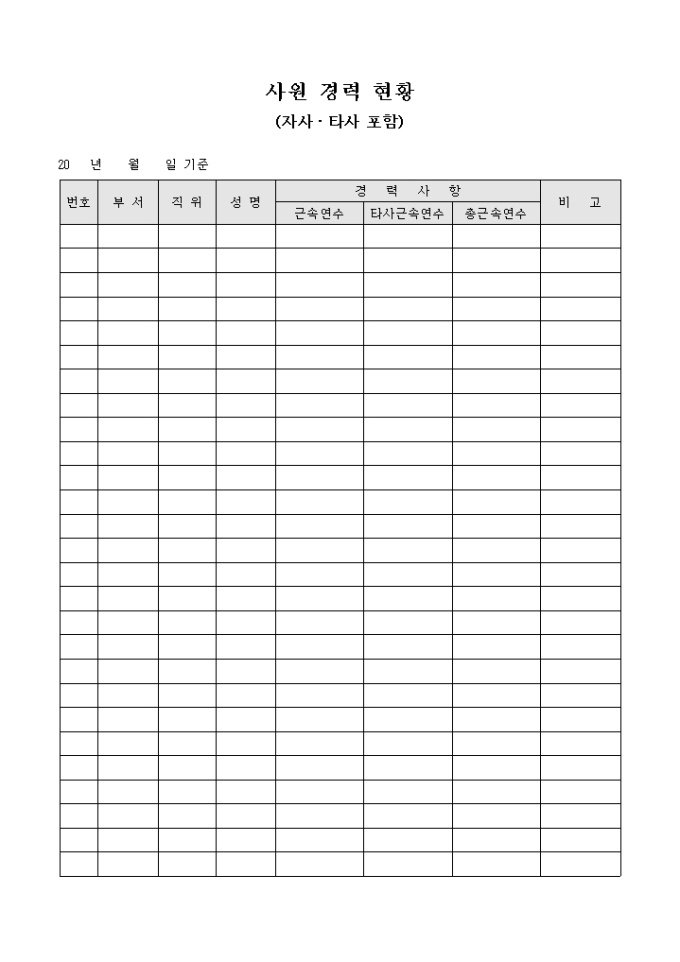 9,000원/월회사원의 경력 사항등을 확인할때 사용하는 문서입니다. 경력사항, 근속연수, 타사근속연수등으로 구성되어 있습니다.