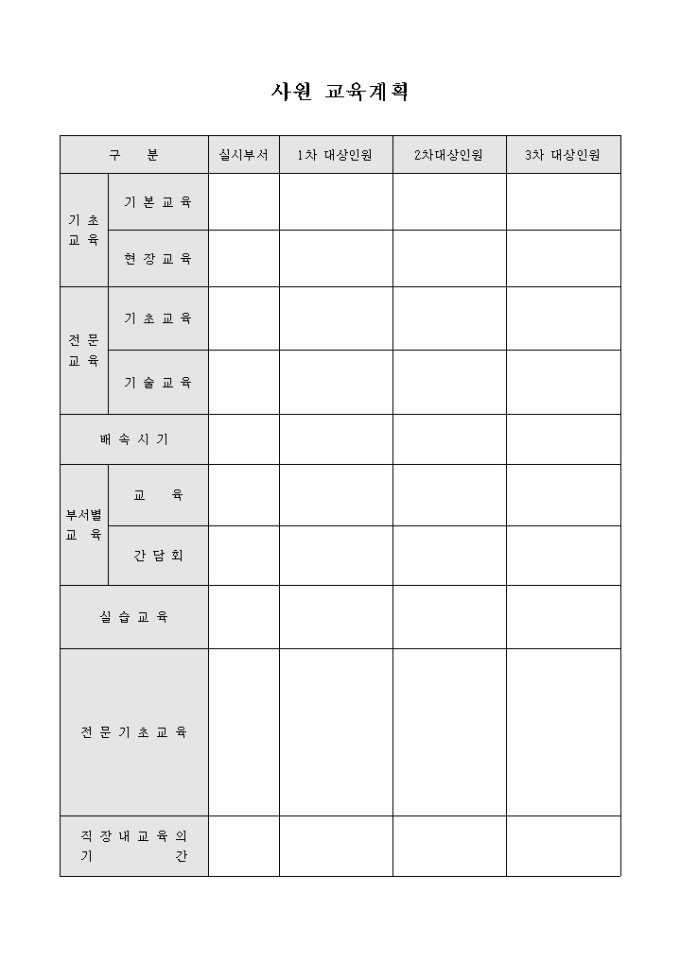 회사에서 사원의 교육계획 작성시 사용하는 문서 입니다. 기초교육, 전문교육, 부서별교육등으로 구성되어 있습니다.