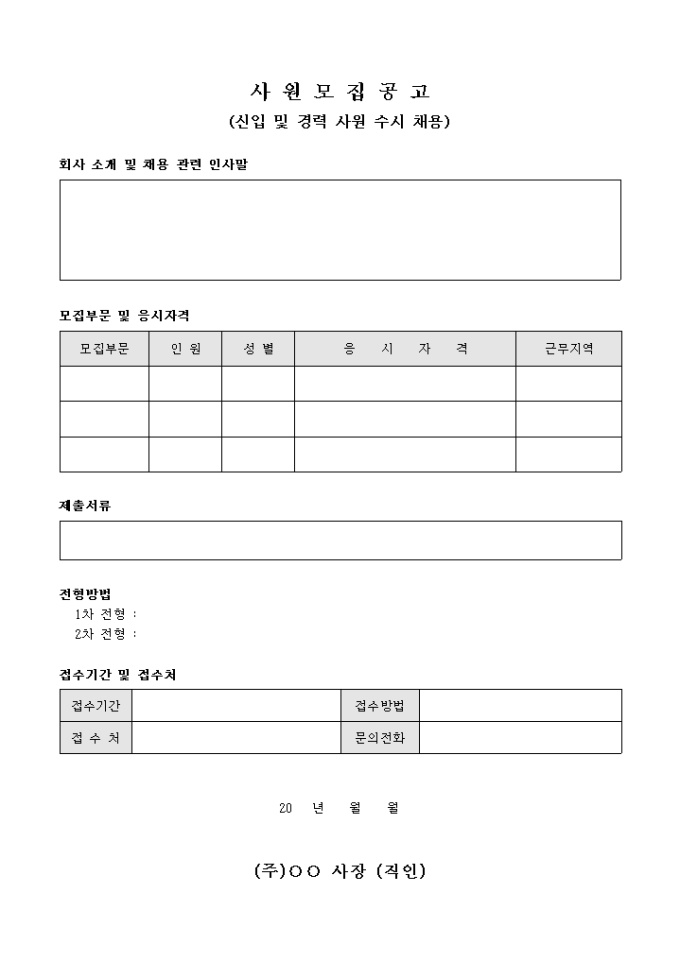 9,000원/월신입사원이나 경력사원을 수시로 채용하고자 할때 사용하는 모집공고문입니다. 모집부문, 응시자격, 제출서류, 전형방법으로 구성되어 있습니다.