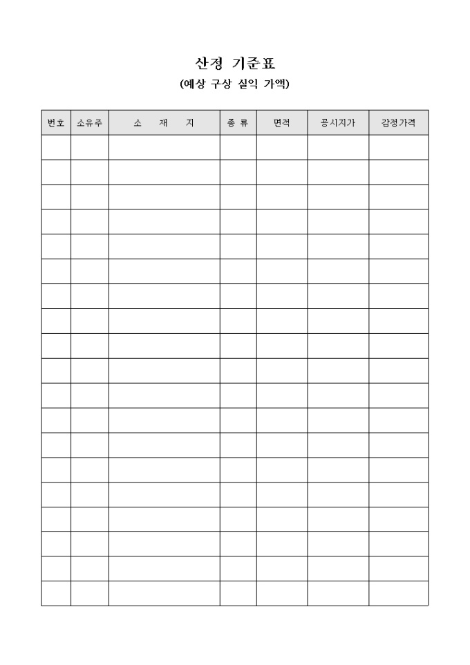 예상구상 실익가액등을 구하고자 할때 사용하는 산전기준표 입니다. 소재지와 면적, 공시지가등으로 구성되어 있습니다.