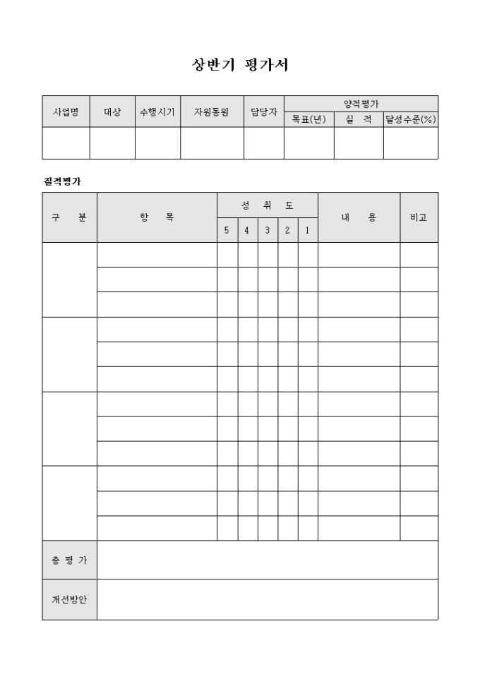 상반기동안의 실적등을 평가할때 사용하는 상반기 평가서 입니다. 항목, 성취도, 내용등으로 구성되어 있습니다.