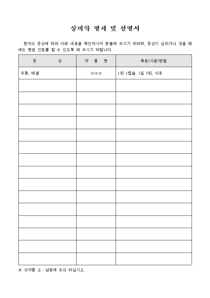 환자의 증상에 따른 상비약품명을 기록한 상비약 명세 및 설명서 입니다. 증상, 약품명, 복용방법등으로 구성되어 있습니다.