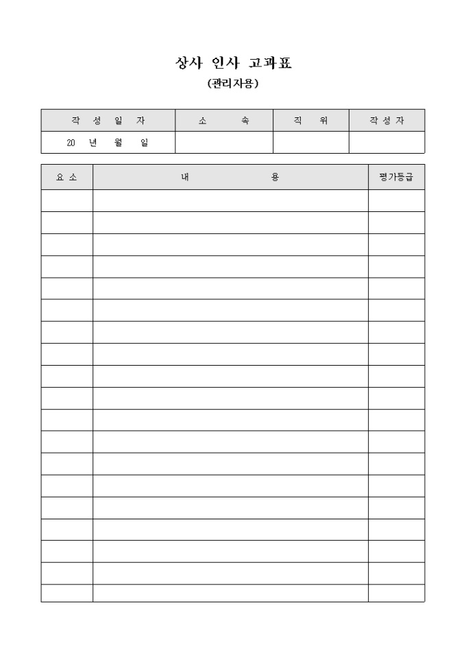 9,000원/월상사 인사고과표 입니다. 요소별 인사고과내용과 평가등급으로 구성되어 있습니다.