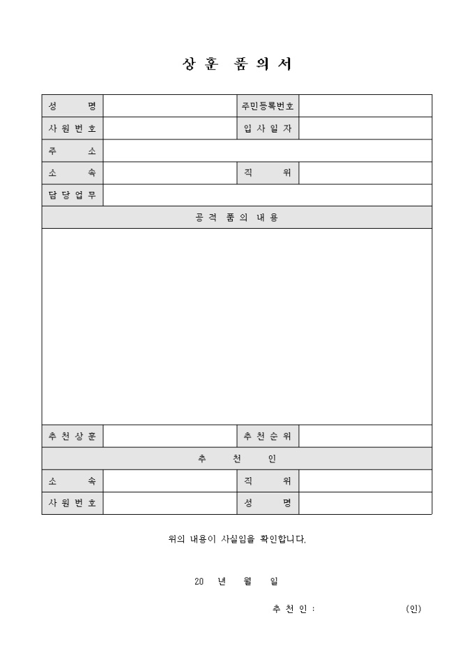 공적품의에 관한 내용등을 기록할수 있는 상훈품의서 입니다.