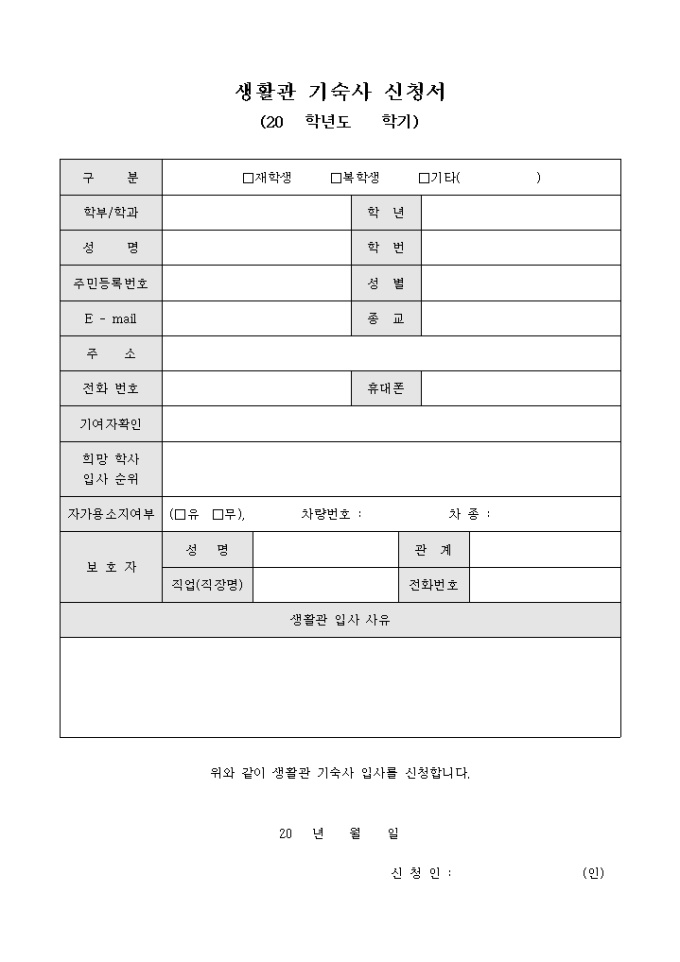 9,000원/월기숙사 입주를 희망할때 사용하는 생활관 기숙사 신청서 입니다. 개인정보와 생활관 입사사유등으로 구성되어 있습니다.