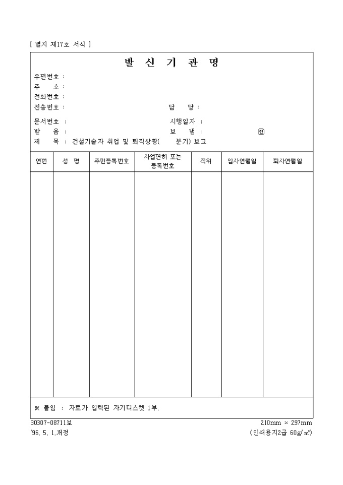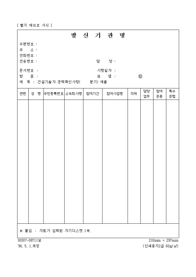 9,000원/월발신기관명 양식입니다. 건설기술자 경력확인사항( 분기) 제출하실때 사용하시는 양식입니다. 경력증명서의 첨부파일 형태로 사용됩니다.